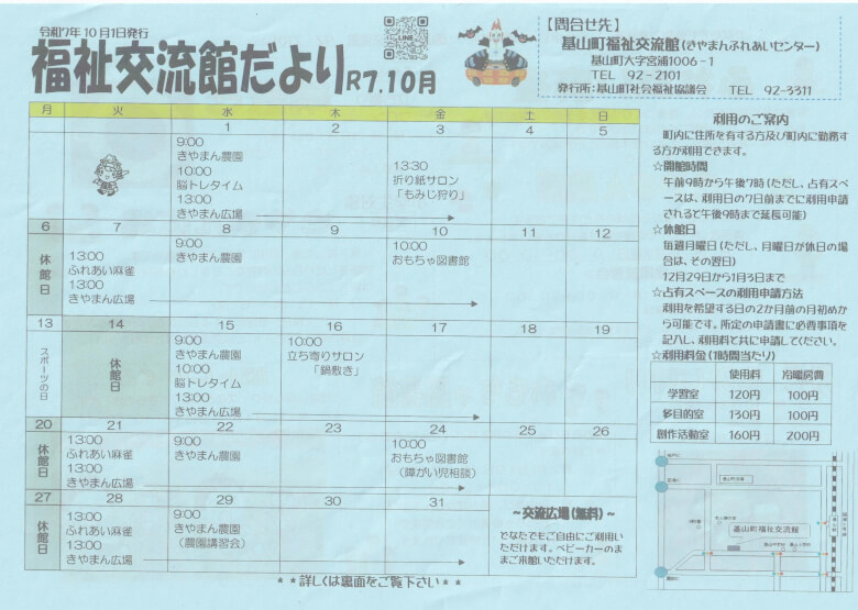 社会福祉協議会の建物の2階が交流スペースとなっている、「基山町福祉交流館」。机と椅子、本がたくさん置いてあり、フリーWi-Fiも利用できる、穴場スポットです。休館は毎週月曜日。今月は13日(月)が開館のため、翌14日(火)が休館となっています。