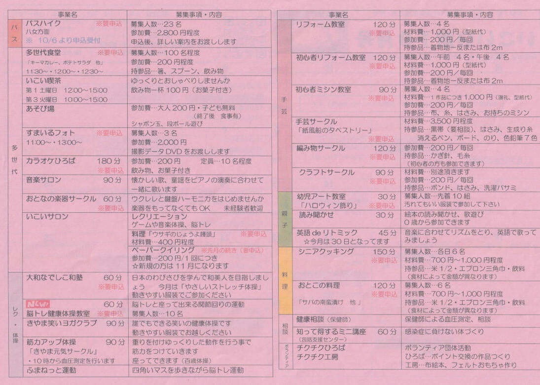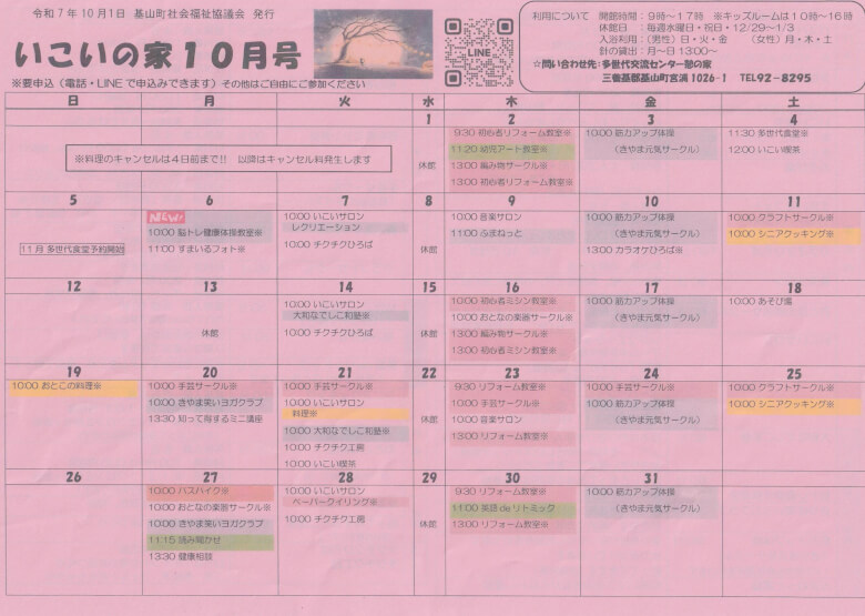 大字基山では各施設から許可を頂き、イベントカレンダーを毎月掲載しています。イベントの予約や持ち物などの詳細は、カレンダー本紙の掲載内容や、主催する施設窓口に直接お問い合わせください。