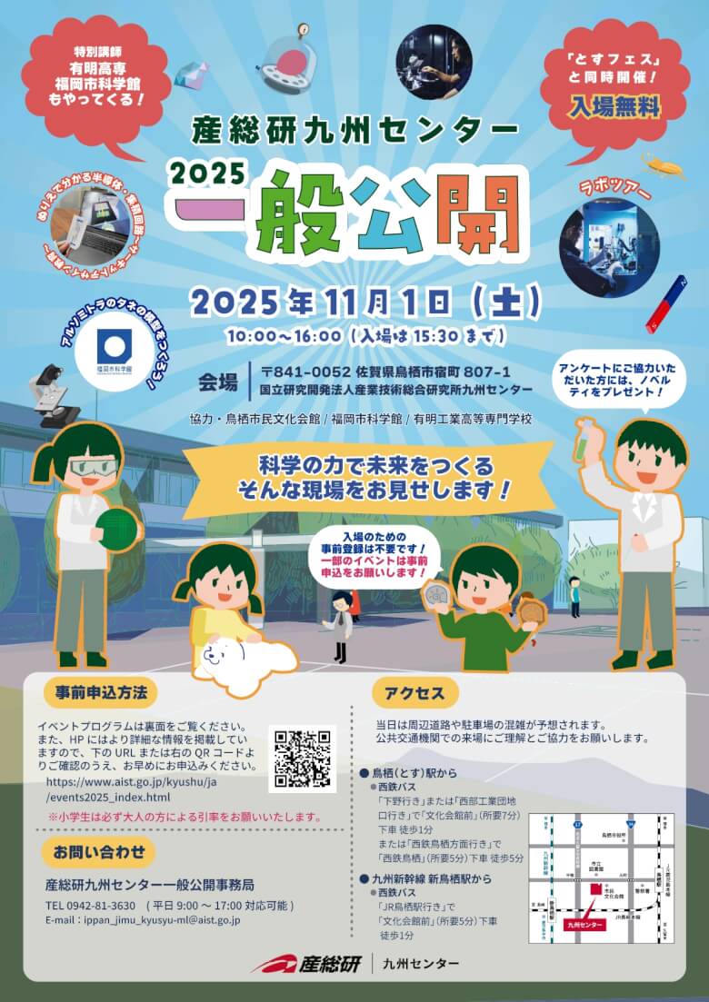 2025年11月1日(土)、佐賀県鳥栖市にある国立研究開発法人、産業技術総合研究所(産総研)九州センターが一般公開されます。入場無料です。