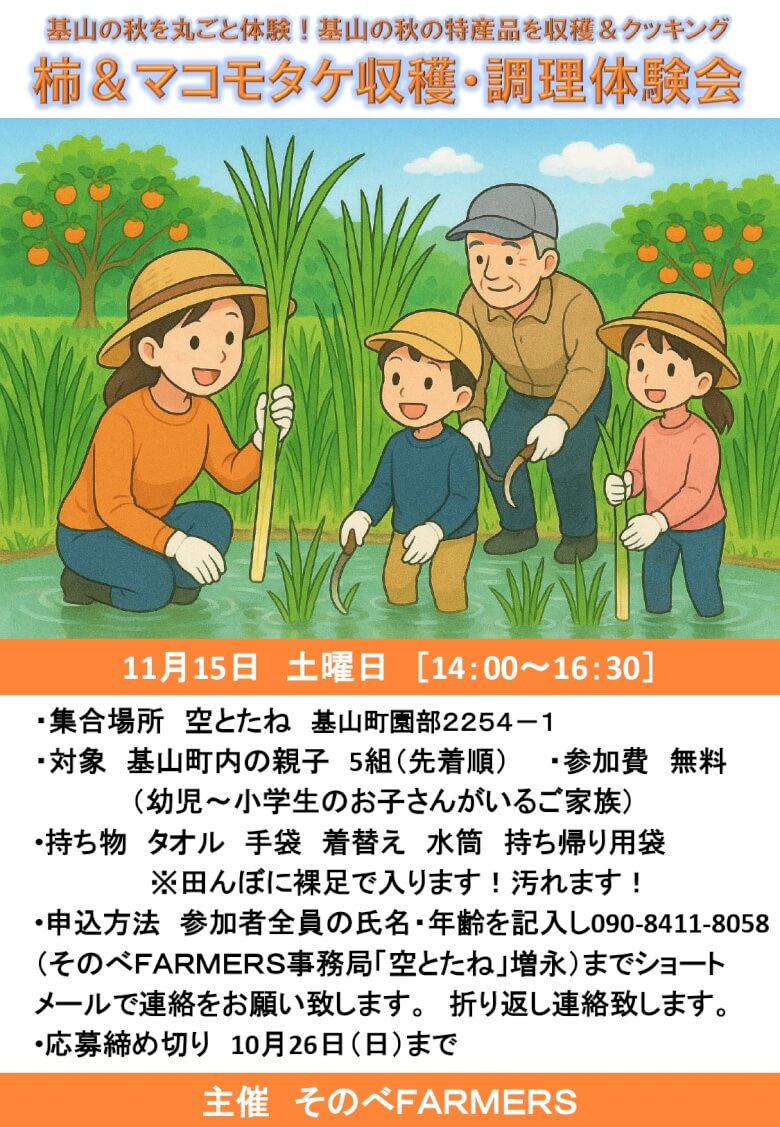 11月15日(土)は、山すそにある柿畑で柿狩りと、秋の水田で育ったマコモタケの収穫体験です。冷たい水田には素足で入るため、濡れたり泥で汚れたりします。着替えやタオルの準備は必須です。