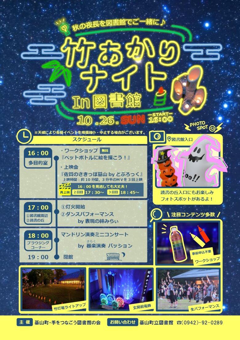 2025年10月26日(日)、今年も秋の夜長イベント「竹あかりナイトin図書館」が基山町立図書館で開かれます。