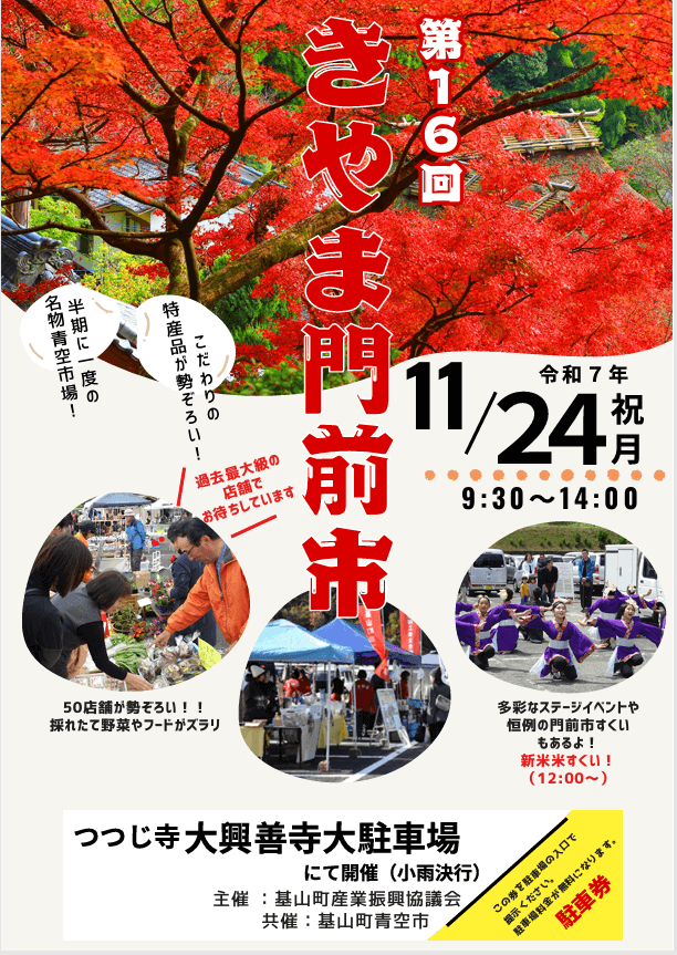 秋の「きやま門前市」が2025年11月24日(月•祝)に、紅葉が見頃を迎える大興善寺の大駐車場で開かれます。午前9時30分から午後2時まで、小雨決行。