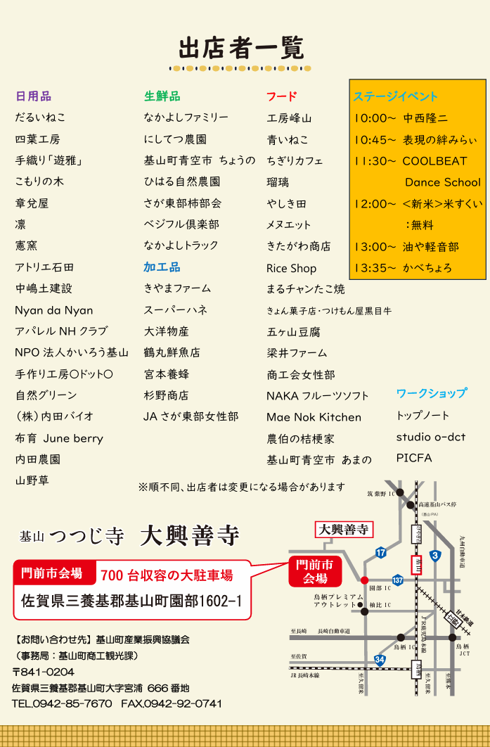 ステージでは、無料の新米・米すくいやダンスなどの催しも予定されています。駐車場は一台300円ですが、基山町内全戸に配布されているチラシを持っていくと、無料になります。