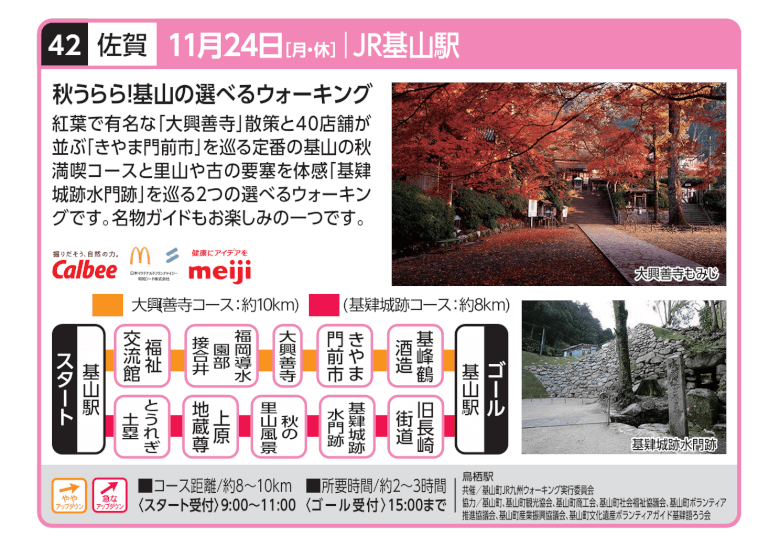 JRウォーキングのコースは、①「大興善寺散策」と「きやま門前市」を巡る「恒例!基山の秋満喫コース」(最大10㎞)と、②国特別史跡の基肄城(きいじょう)跡を巡る「基肄城跡・水門跡コース」(最大約8㎞)を選べるようになっています。