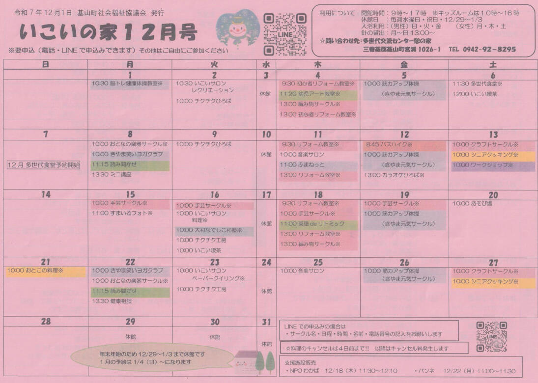 12/6(土)は、寄付等で集まる食材を活かした「多世代食堂」。今月は『タンドリーチキン・シャケシチュー』などのメニューが予定されています。対象は町内在住の方。参加の際には、200円程度の募金協力のお願いがあります。事前に要申し込みで、箸・スプーン・飲み物は持参ください。